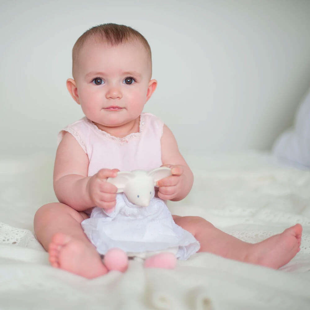 Muñeca Ratona e de tela de Meiya & Alvin. Juguete de entretenimiento y apego para bebes. También funciona como mordedor ya que que tiene la cabecita de caucho natural, diseñado especialmente para calmar el picor de las encías de los bebes.