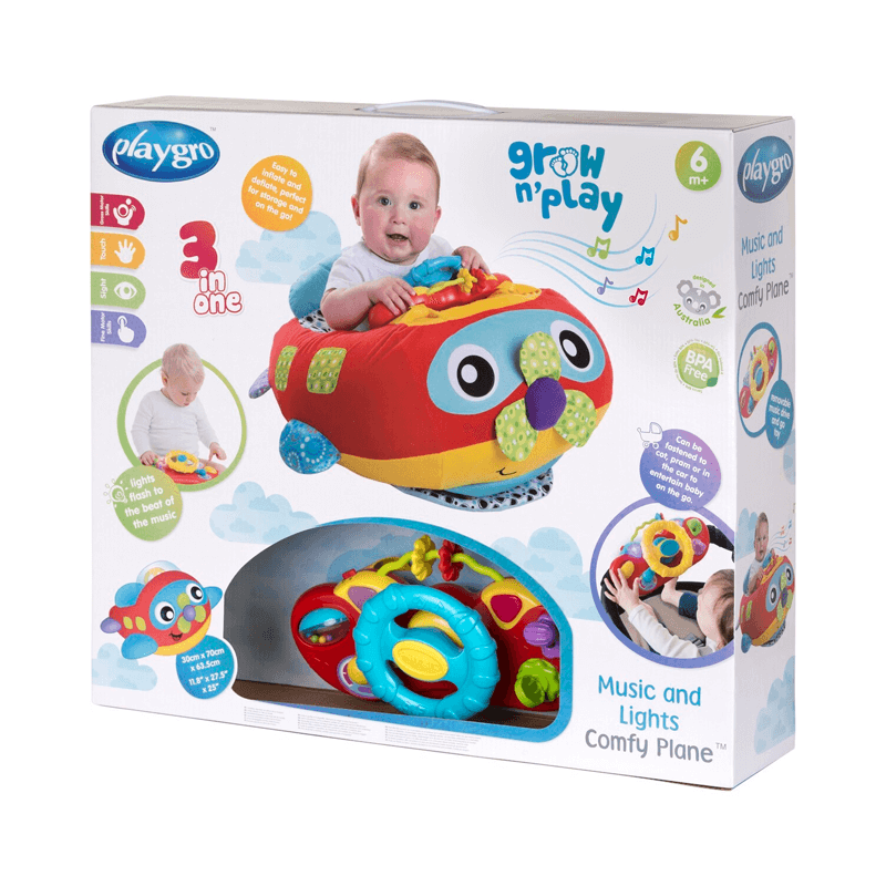 Zoooom! Este adorable avión cómodo de música y luces volará bebé donde sea que su imaginación los lleve. Este lujoso avión de sentarse y jugar presenta un tablero de actividad musical extraíble que se conecta fácilmente a los cochecitos, cochecitos o cápsulas para aún más aventuras mientras viajas. Una bocina musical, un indicador de clic, un volante realista y telas texturizadas hacen que la diversión en el juego sea interminable al tiempo que respaldan la habilidad motora y el desarrollo sensorial. Una vez que el bebé ha desarrollado la capacidad de sentarse de forma independiente, el Playgro Music and Lights Comfy Plane proporciona un lugar seguro para jugar, incluido un suave y lujoso entorno para su tranquilidad, en caso de que se desequilibren. ¡Este atractivo espacio de juego estacionario es el compañero perfecto de nuestro Music and Lights Comfy Car para el doble de diversión en la conducción!