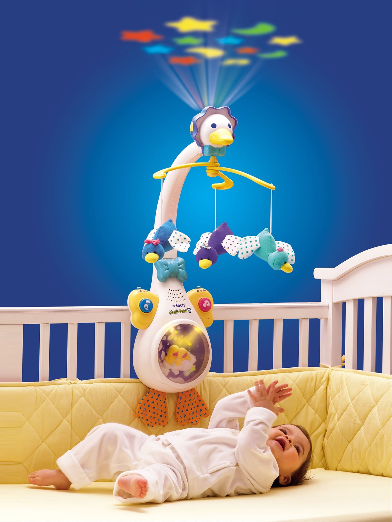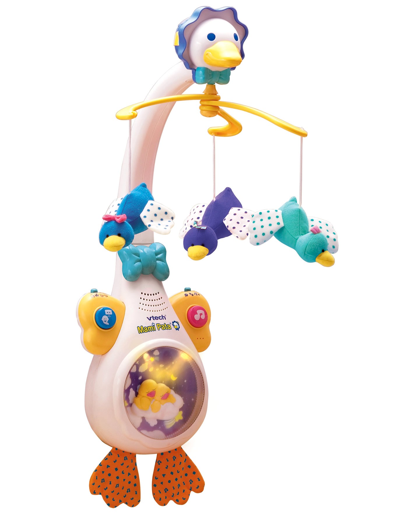 Mami Pata 4 en 1 de VTech es un juguete especial para bebés que reúne melodías clásicas, sonidos de la naturaleza, una bonita melodía cantada… y todo ello combinado con las luces de su proyector y luz frontal y el delicado movimiento de los patitos del juguete. Además, incluye un sensor de sonido y la posibilidad de grabar la voz de los padres para que, si el niño se despierta llorando, el juguete lo detecte y se active iniciando su funcionamiento con la voz grabada.