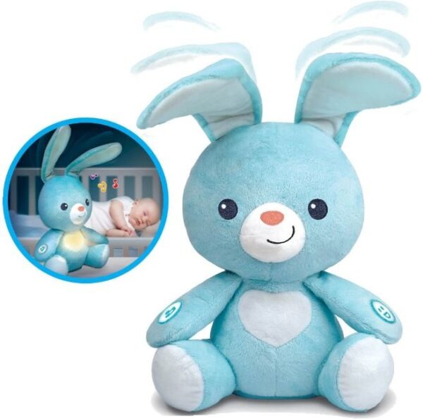 ¡Es hora de dormir… o jugar! Este conejitoacompañará a tu bebé a la camita y le cantará canciones para tener dulces sueños. Y por el día, ¡a jugar al escondite! Es un peluche blandito y suave con luz nocturna y dulces sonidos. ¡Tu peque se dormirá y despertará escuchandosus canciones!